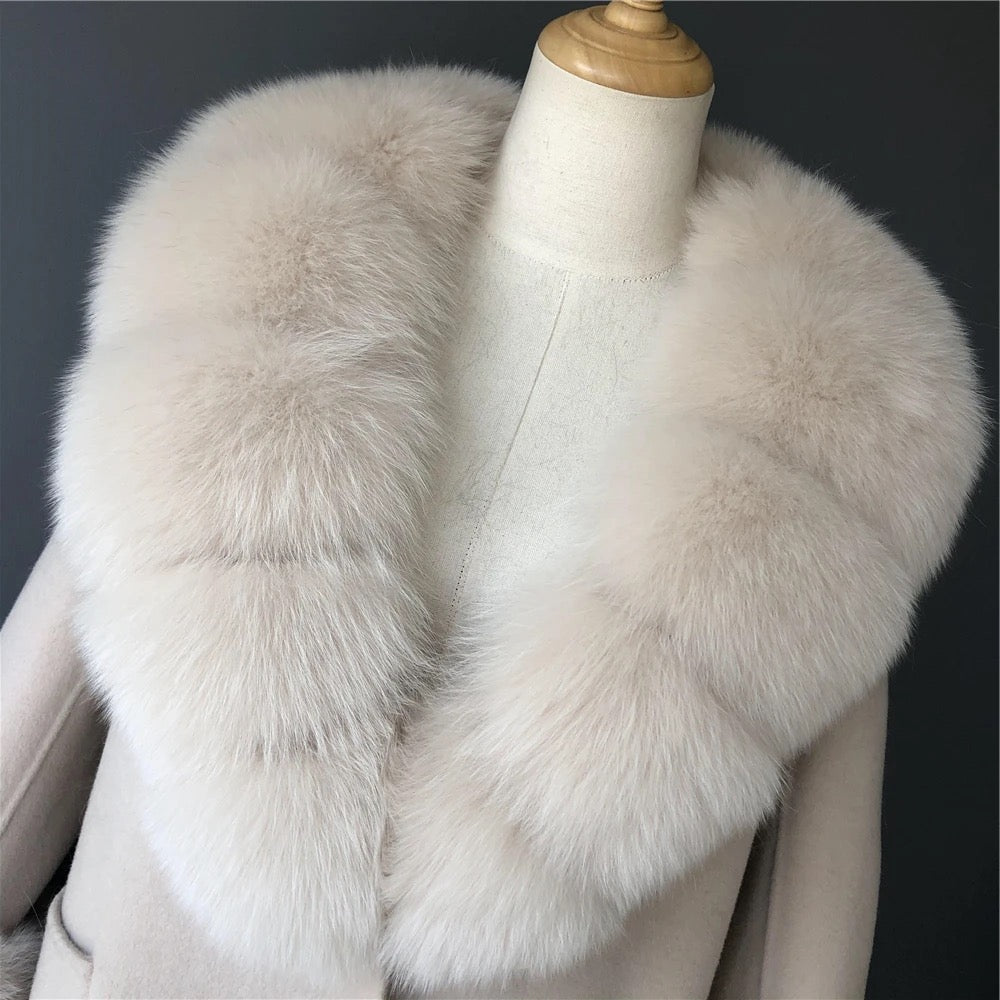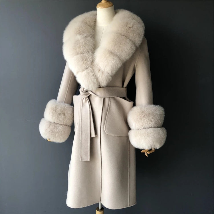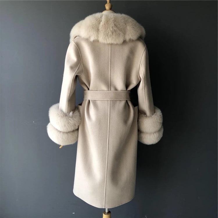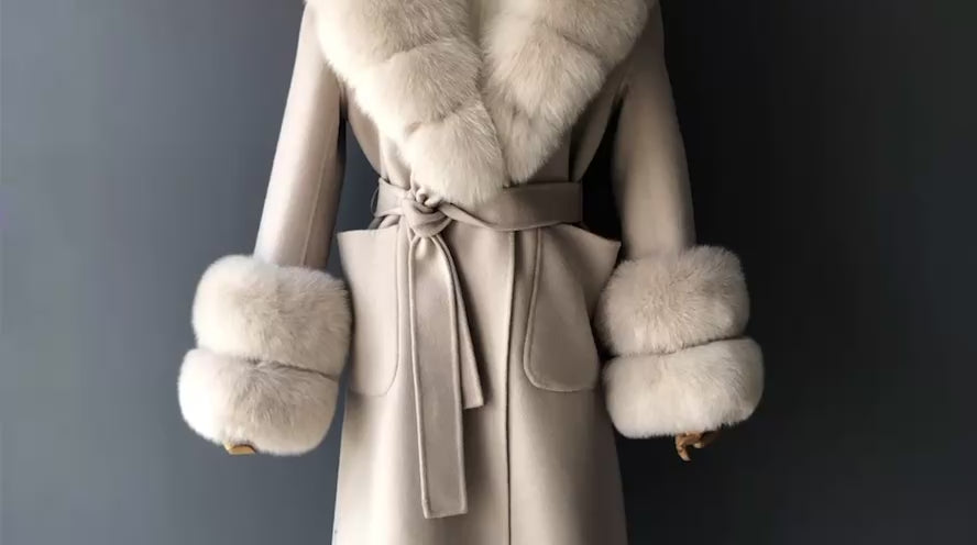 Its large collar and cuffs feature genuine fox fur, adding a touch of sophistication and glamour to your silhouette while providing cozy warmth on the coldest days. The long, double-faced design ensures a chic look and optimal protection against the cold.