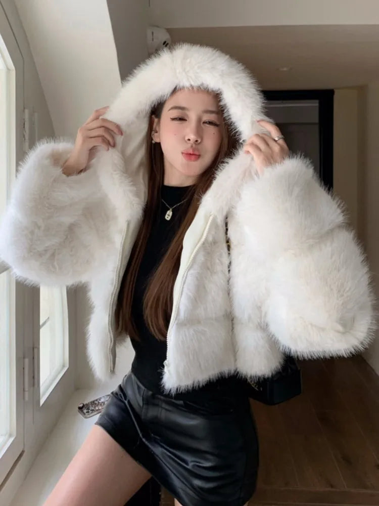 Stay stylish and warm this winter with our short faux fur hooded coat – a must-have for every fashion-forward wardrobe.